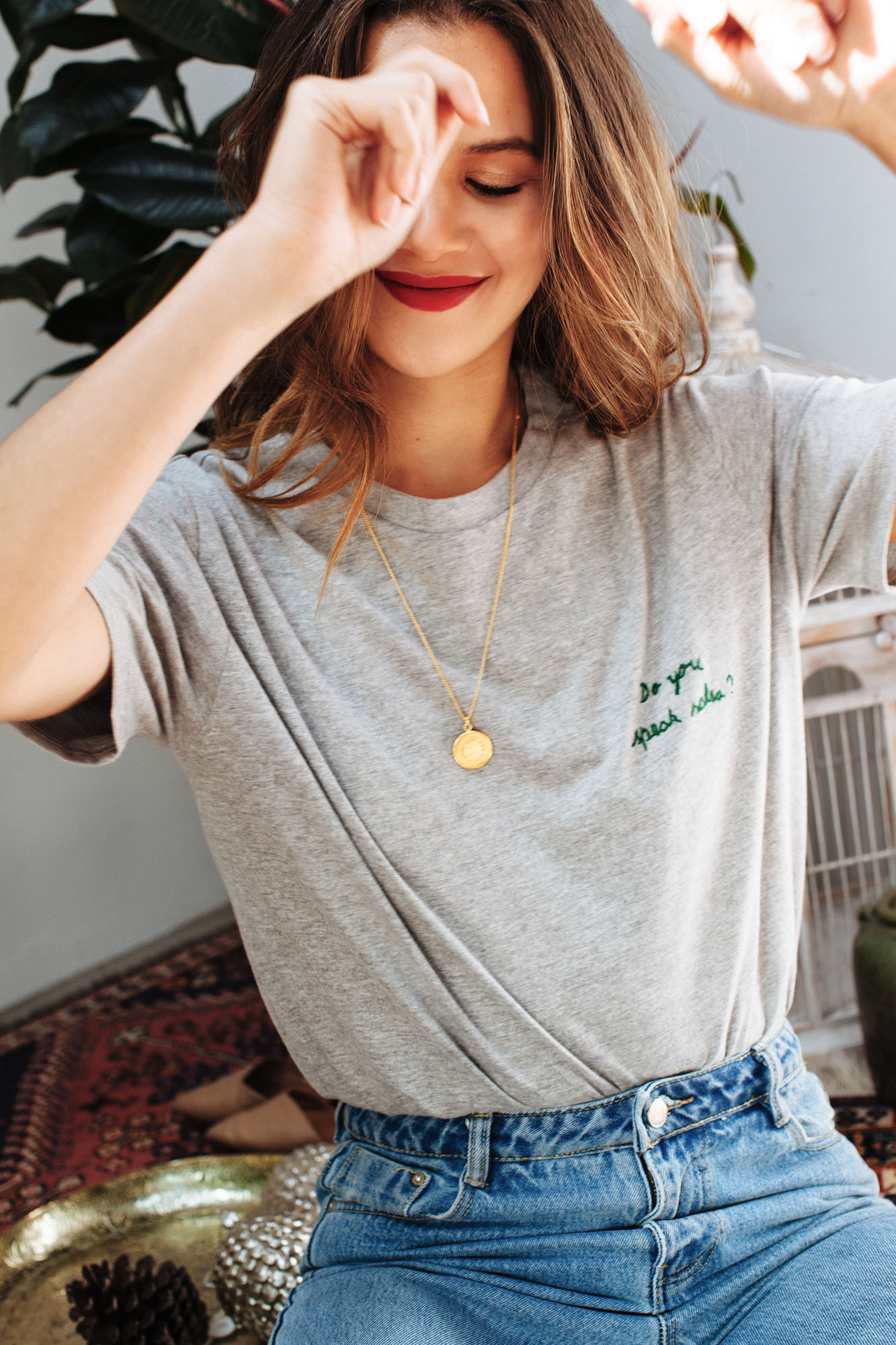 Camiseta gris bordada a mano en algodón 100%