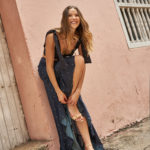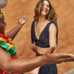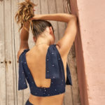 Top azul de triangulo, con amarres en los hombros y botones forrados.
